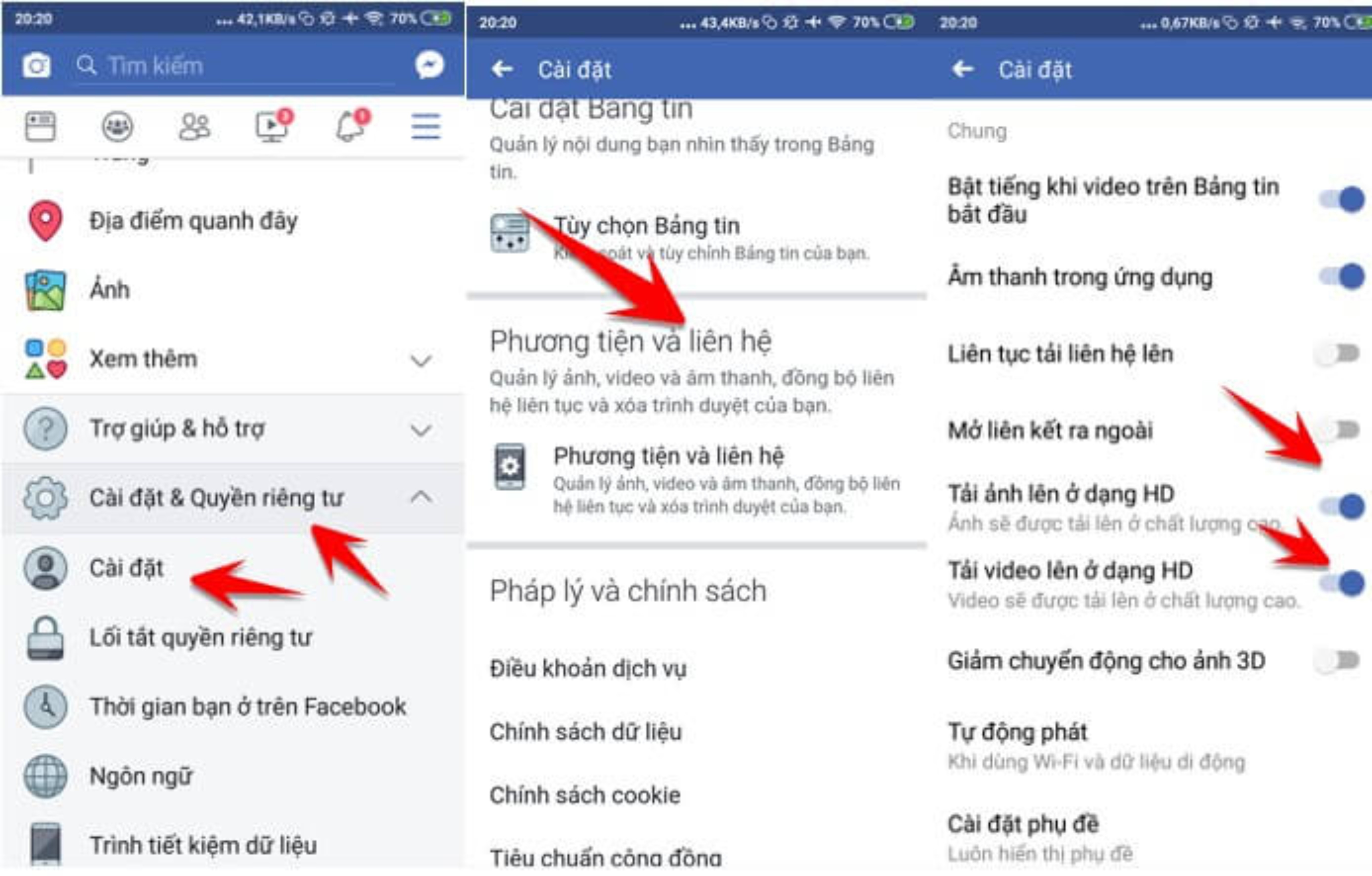 Please follow these steps to be able to post HD videos on facebook when using an Android phone: Step 1: First, access Google Play and update the Facebook app with the latest version. Step 2: Next, open Facebook, and go to the Settings of this app. Step 3: Then you find and select the item "Install applications" select settings. In this section you will continue to search for "media and contact", enable all options to download photos and videos in HD. Do this by turning the switch green successfully. If you do not see the item above to choose from then go to the "settings" on the phone, click on "apps", continue to select Facebook and choose Clear Cache and Clear Data. This will delete all the old login information so you can start logging in again.